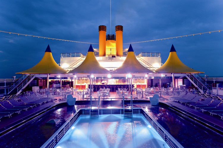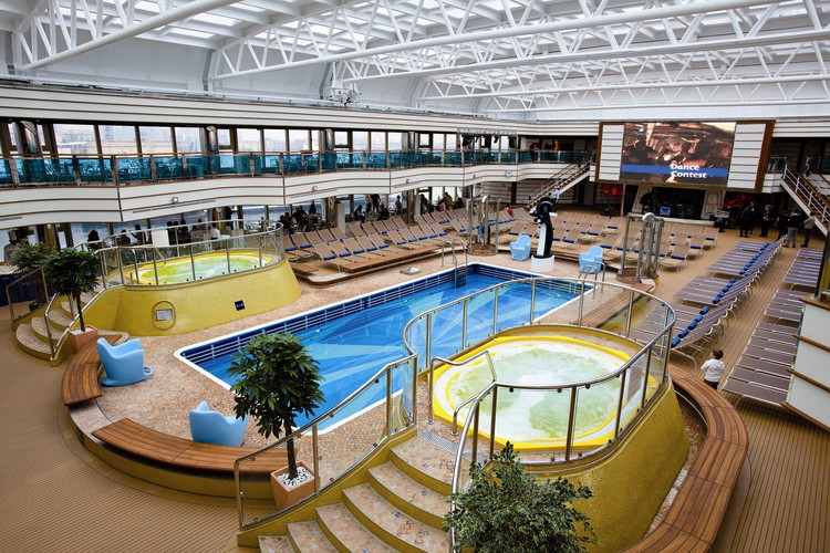 Die fantastische Ausstattung: Insgesamt 1130 Kabinen, 106 Suiten mit Balkon, 4 Restaurants, 11 Bars, 2 Swimmingpools (einer mit ausfahrbarem Dach), 4 Jacuzzis, Jogging-Parcours, Rollschuhbahn, Yoga Bereich, Putting Green, Golf Simulator, Sportplatz, Fitnesscenter